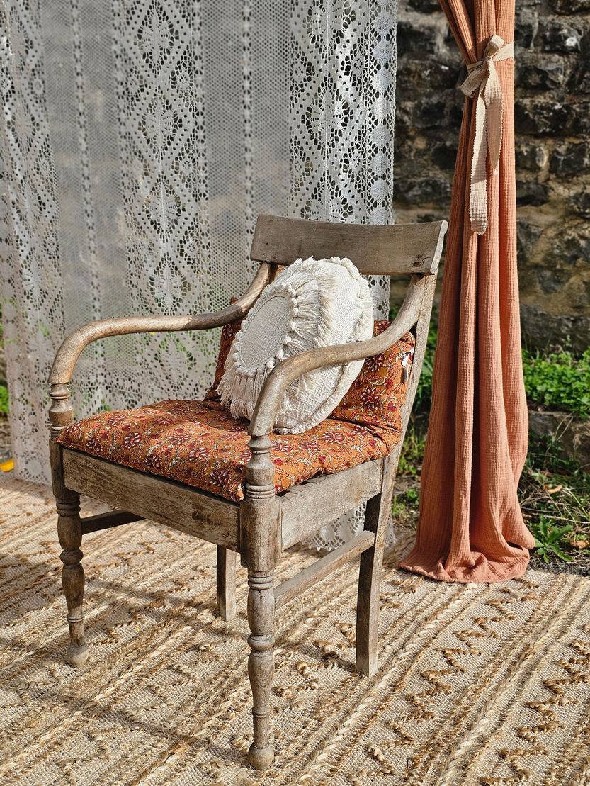 Une arche, un tissu brodé, deux tissus en gaz de coton, une guirlande, deux fauteuils, trois coussins, un tapis, un bougeoir, deux lanternes.