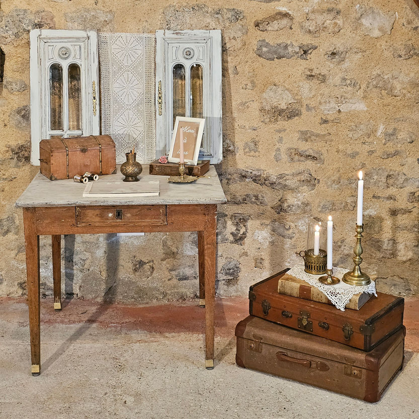 Une table, deux petites portes, deux tissus en dentelle, une urne en bois, deux livres, quatre bougeoirs, un cadre, une fleur en faience, une paire de jumelles en nacre, un petit brûle parfum, deux valises.
